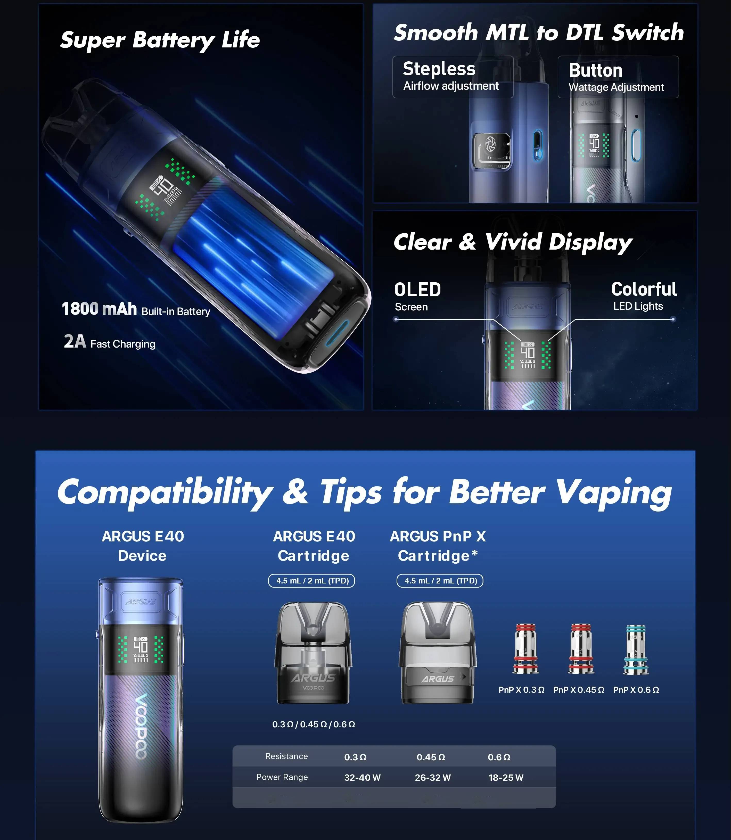 • Compatible Cartridge/Coil Argus E40 Cartridge 0.45Ω, Argus PnP X Cartridge with PnP X 0.3Ω/0.45Ω/0.6Ω