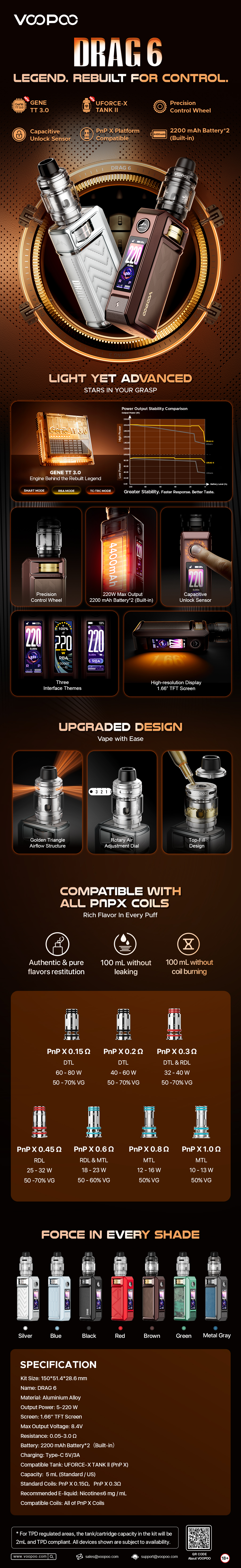 The DRAG 6 is a professional-grade built-in battery MOD designed for superior taste, precise control, and stable high-power performance. Powered by a 4400 mAh built-in battery with up to 220 W output and driven by the all-new GENE TT 3.0 chip, it delivers faster response, more stable output, and enhanced safety for both DTL and MTL vaping. Paired with the upgraded UFORCE-X TANK II (PnP X), the refined airflow system ensures smoother vapor and richer flavor. Combined with the Precision Control Wheel and Capacitive Unlock Sensor, every adjustment remains precise, intuitive, and effortless.