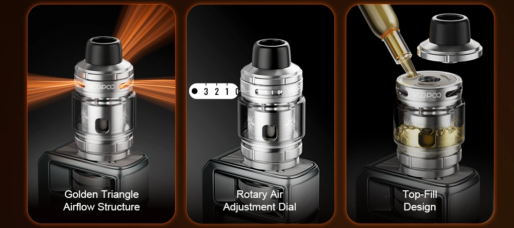 (3) UFORCE-X Tank II: The innovative golden triangle airflow structure ensures smooth airflow and thorough atomization, significantly enhancing flavor layering. The design of a top-filling system and top airflow effectively prevents leaks. The large 5ml transparent tank reduces the anxiety of frequent refills, easily covering a variety of scenarios from DTL to MTL.