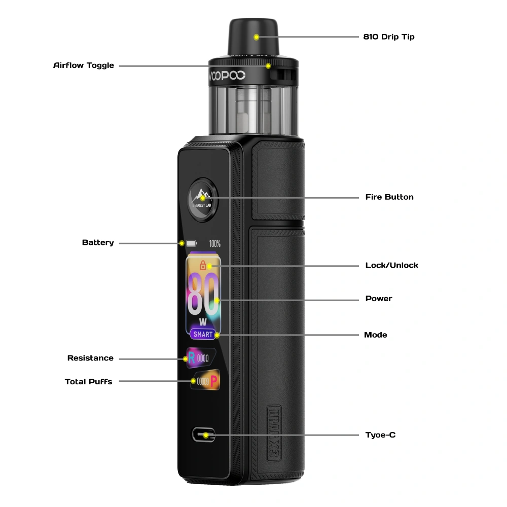 DRAG X3 features a removable 810 threaded drip tip, enabling a customized experience for compatible vapes. PnP X coil sustains 100 ml e-liquid without flavor fading and coil burning, bringing you authentic and pure taste.