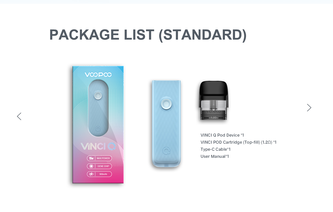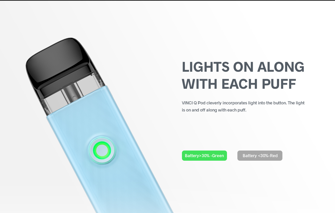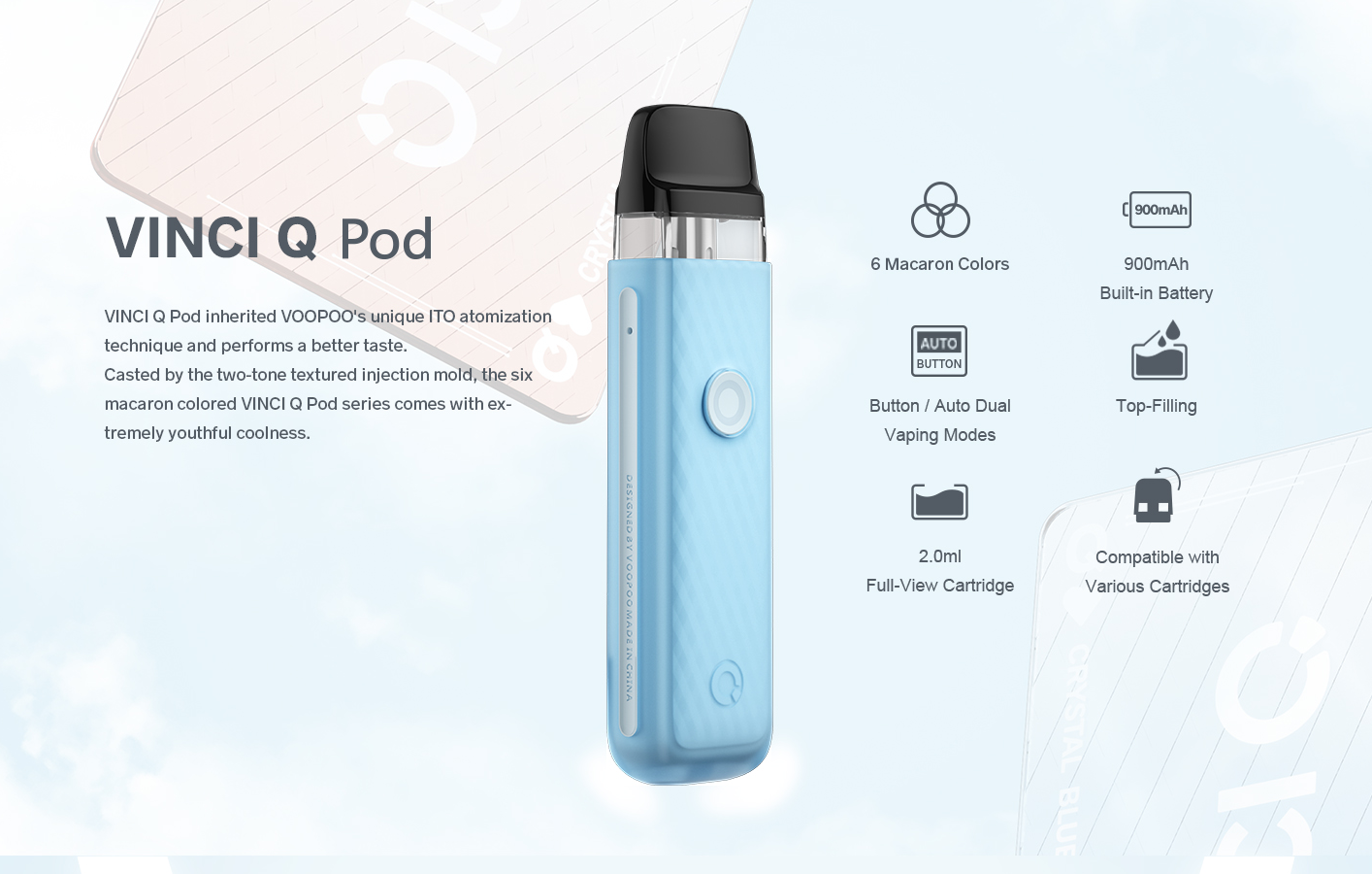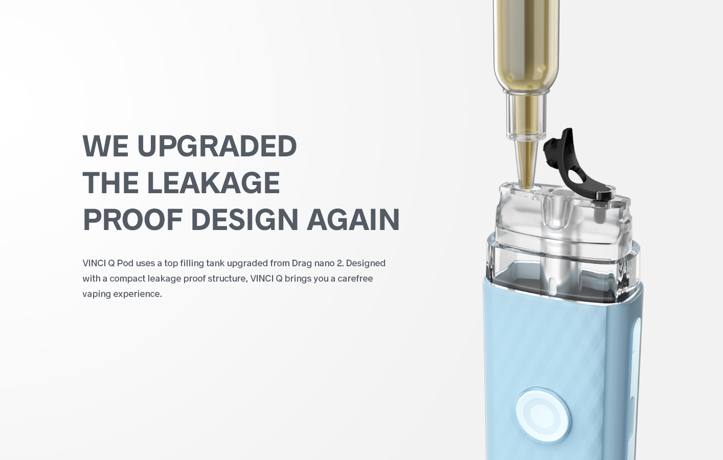 2.0ml capacity visible tank makes it easy for you to control the level at any time, sparing you the worry of suddenly running out of . Meanwhile, simplified filling means that there is no need to take the tank out. Just take off the nozzle, and then the filling can be finished. The VINCI Q POD is also compatible with the following cartridges: VINCI POD Royal Edition, Drag Nano 2, VINCI POD.