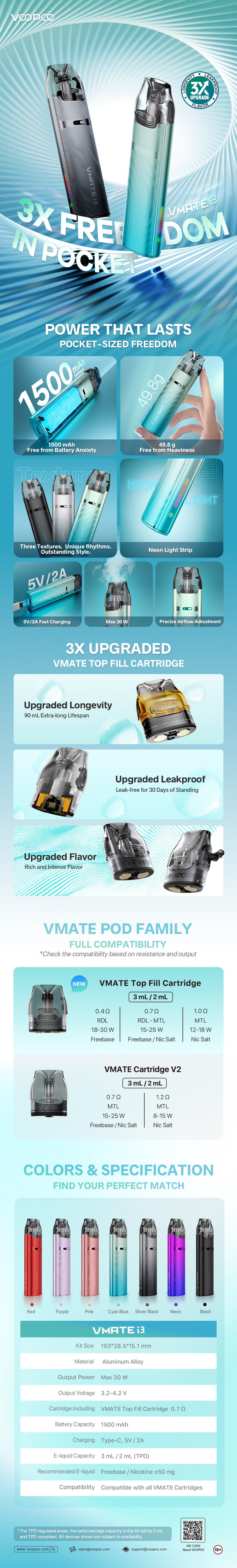 - (2) VMATE i3 is compatible with VMATE Top Fill Cartridge (3mL/2mL, 0.4Ω/0.7Ω/1.0Ω) and VMATE Cartridge V2 (0.7Ω/1.2Ω).