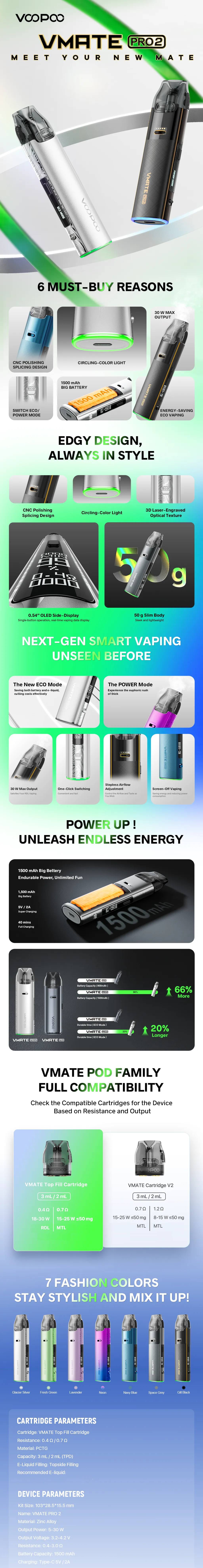 VMATE PRO2 is defined as An Energy-Saving Large Battery POD. Not only does it continue the VMATE Series' advantages of simplicity, easy-to-use, and smoothness, but it also sees significant improvements in battery capacity, appearance design, and vaping experience, achieving “Better look, Better experience, and Better value.”