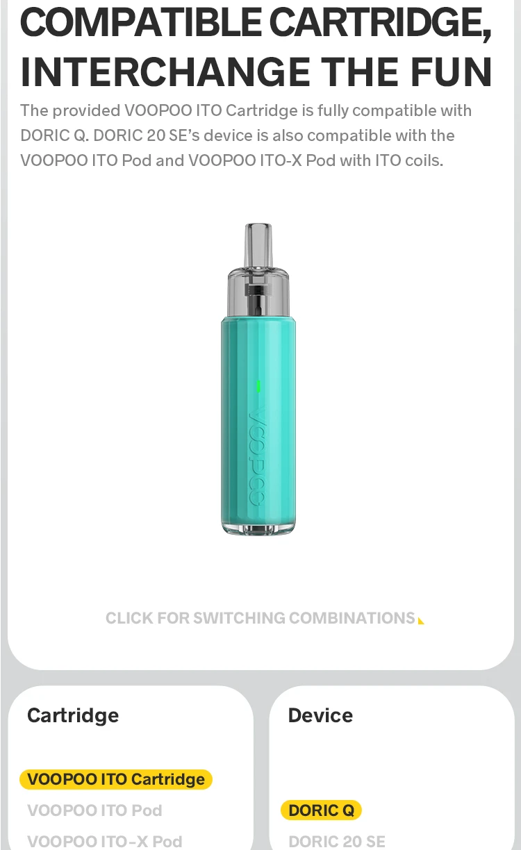 - Compatible Cartridge:VOOPOO ITO Cartridge 0.7/1.0/1.2Ω,VOOPOO ITO-X POD,VOOPOO ITO POD