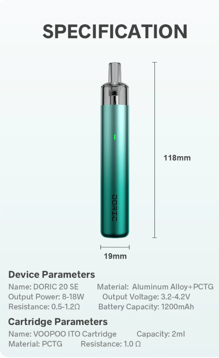 Doric 20 SE, a starter product, is simple and durable from appearance to function. Paying homage to the classic design, Doric Order, DORIC 20 SE shows the beauty of strength and elegance with the ratio of column height to column diameter of 6:1, It’s equipped with VOOPOO ITO Cartridge. DORIC 20 will support 3 days' product with 1200mAh built-in battery and last 10 days' product with a rather economical consumption.
