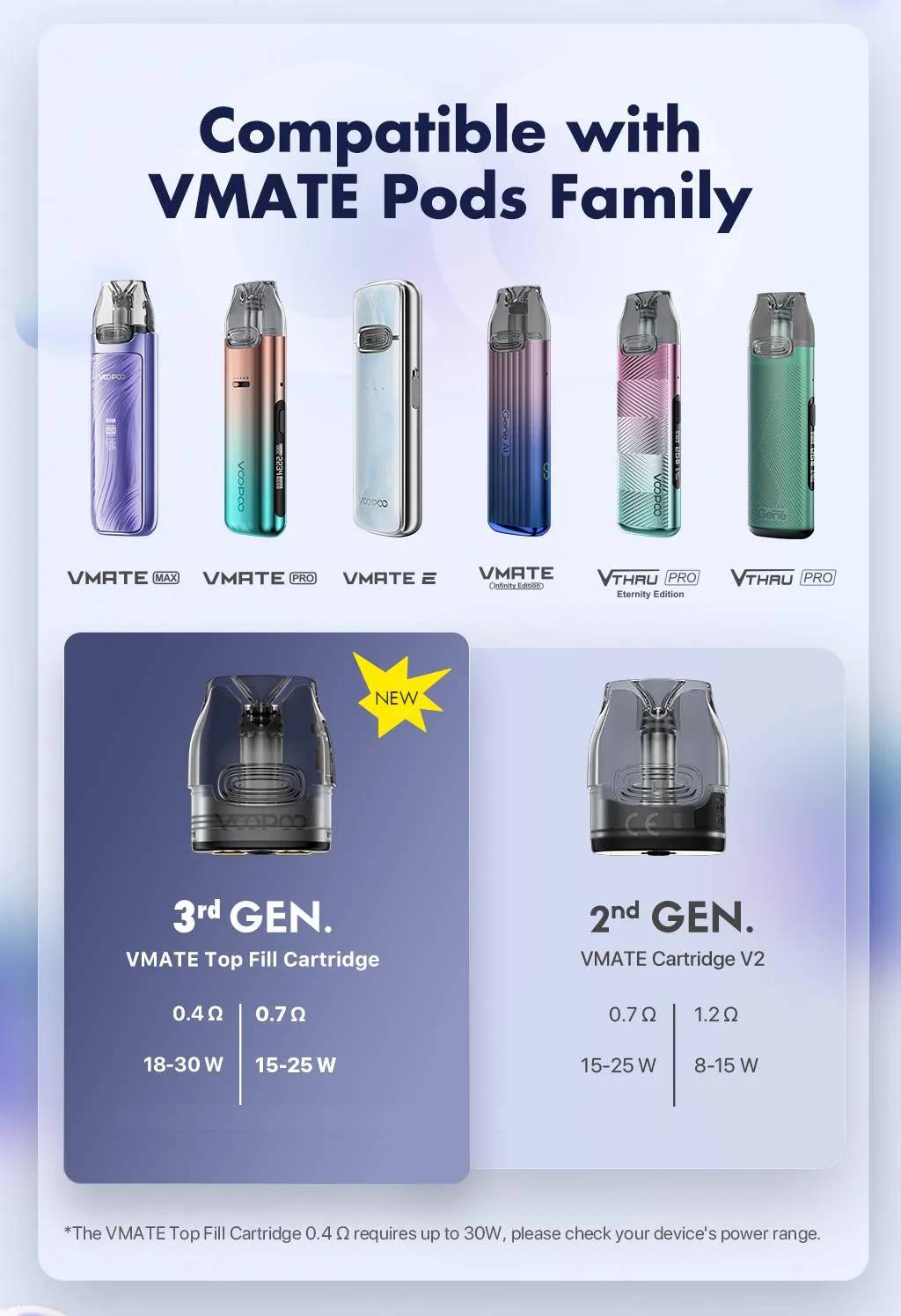 VMATE MAX is equipped with VMATE Top Fill Cartridge with a “3X” upgrade, greatly improving the cartridge lifespan, leakage prevention and options. It is excellent in vaping 90 mL capacity without burning, no leaking for 30 days at a standstill, and has a rich and consistent options.The cartridge resistance is as low as 0.4 Ω and supports Freebase capacity. Combined with a 30 W max power output, it brings users a more enjoyable and quick relief of RDL vaping experience.The filling is upgraded to a more convenient and quicker top filling.